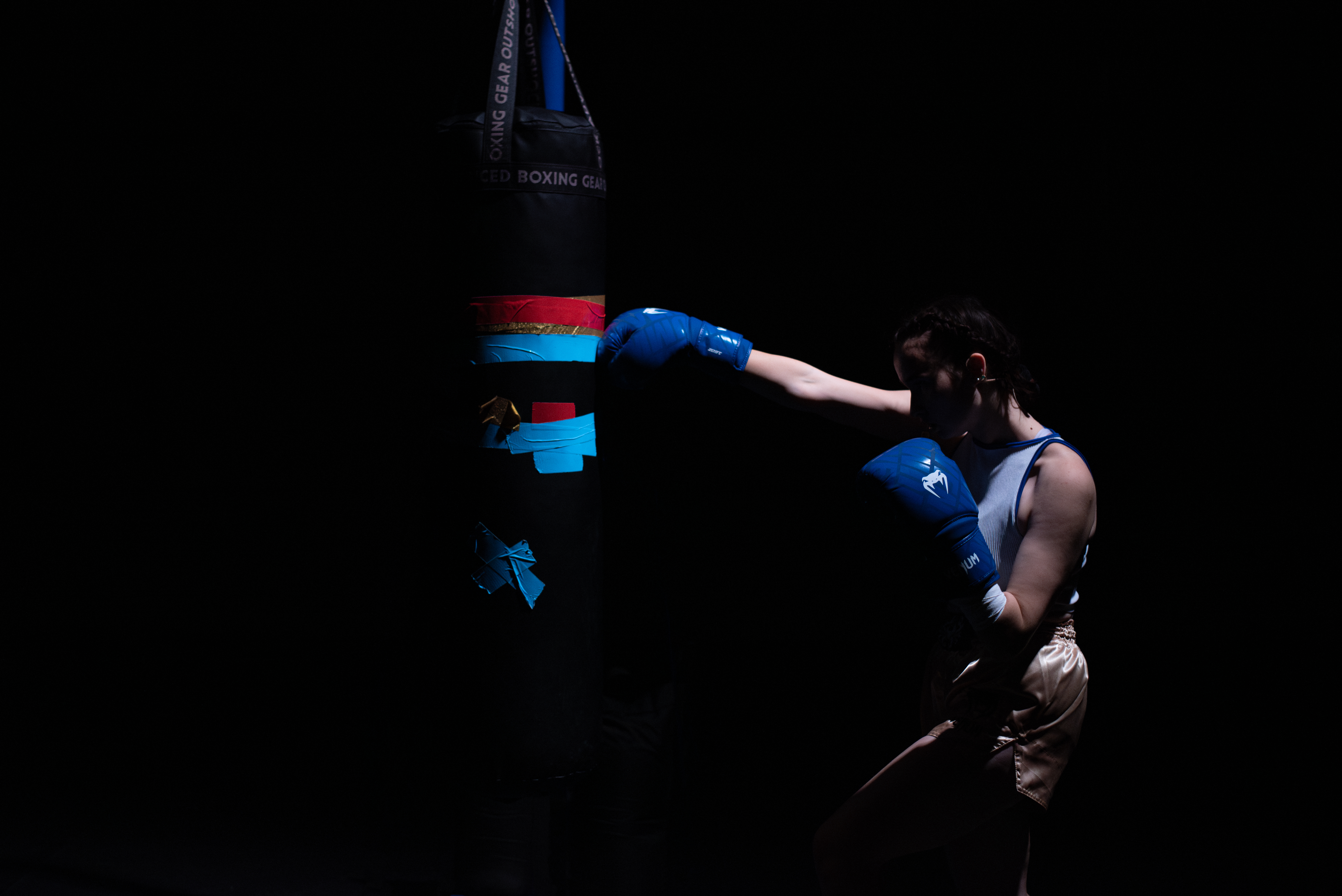 Un punching-ball, un banc de vestiaires, une corde à sauter au sol, un ring…